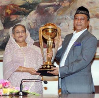 Prime Minister Sheikh Hasina on Friday witnessed the much-coveted World Cup Cricket Trophy, which is now in Bangladesh as part of its visit to countries that are going to participate in next year’s World Cup Cricket Tournament. Officials of the International Cricket Council (ICC) and Bangladesh Cricket Board (BCB) brought the World Cup to the Prime Minister’s official Ganobhaban residence in the morning to show her the spectacular trophy. Speaking on the occasion, the Prime Minister asked the cricket players of Bangladesh national team to take preparations with utmost sincerity for better result in the upcoming World Cup, 2015. ‘I hope that you will further brighten the country’s image by showing excellent performance in the World Cup, and for this, you will have to practice with utmost attention,’ she said, according to BSS.