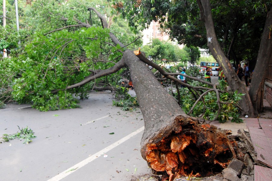 Policemen and fire service personnel remove a century-old tree which fell down on Wednesday as its root got rotten. The picture was taken from the city's Curzon Hall area — Focus Bangla