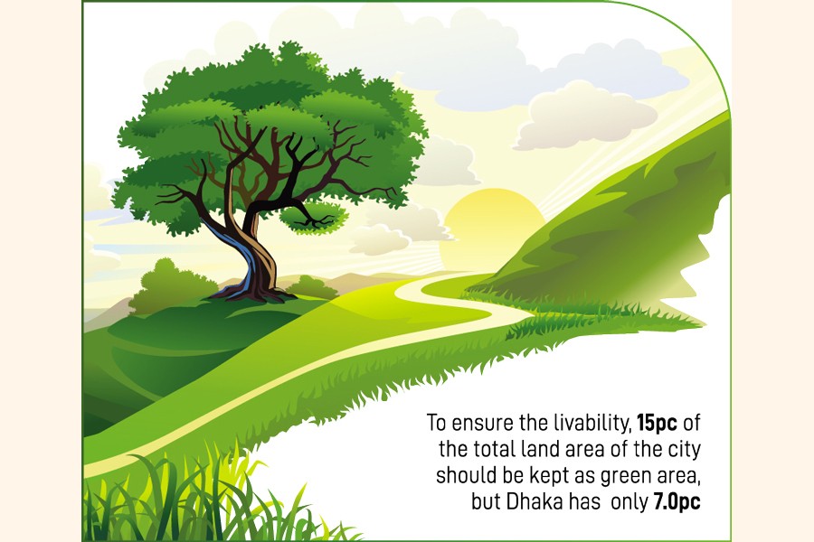 To ensure the livability of the city, 15 per cent of the total land area of the city should be kept as green area. It is only 7.0 per cent in Dhaka city.