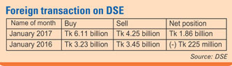 The overseas investors bought shares worth Tk 6.11 billion, while they sold stocks of Tk 4.25 billion in January 2017, to take their net investment for the first month of the year to Tk 1.86 billion, according to statistics from the Dhaka Stock Exchange (DSE).