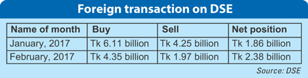 In February 2016, the overseas investors bought shares worth Tk 3.71 billion and sold shares worth Tk 2.76 billion to take their net investments to Tk 950 million.