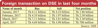 Foreign investors bought shares worth Tk 4.69 billion and sold stocks of Tk 3.98 billion to take their net investment to Tk 700 million in April, according to statistics available from the Dhaka Stock Exchange (DSE).