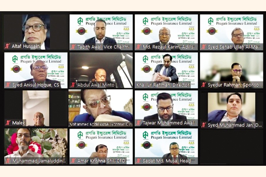 Pragati Insurance Limited held its 37th Annual General Meeting on a digital platform on Thursday, with its Chairman Syed M Altaf Hussain in the chair. Vice-chairman Tabith M. Awal and members of the Board of Directors Abdul Awal Mintoo, Khalilur Rahman, Mohammed Abdul Awwal, Md Syedur Rahman Mintoo, Mohammed Abdul Malek, Nasir Latif, Syed Muhammad Jan, Tajwar M. Awal, Nigar Jahan Chowdhury, Independent Directors Muhammad Jamaluddin, H. Naher and Advisor Md Rezaul Karim, CEO Syed Sehab Ullah Al-Manjur (ACII), CFO Amar Krishna Shil, Company Secretary Syed Anisul Hoque and a large number of shareholders joined the AGM. The meeting approved 25 per cent cash and 5 per cent stock dividend to its shareholders for the year 2022.
