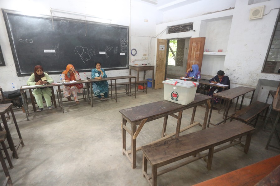Presiding and polling officers sitting idle amid thin presence of voters in the by-polls to Dhaka-17 constituency held on Monday. The picture was taken from T&T Adarsha Girls High School centre in the city's Mohakhali — FE photo