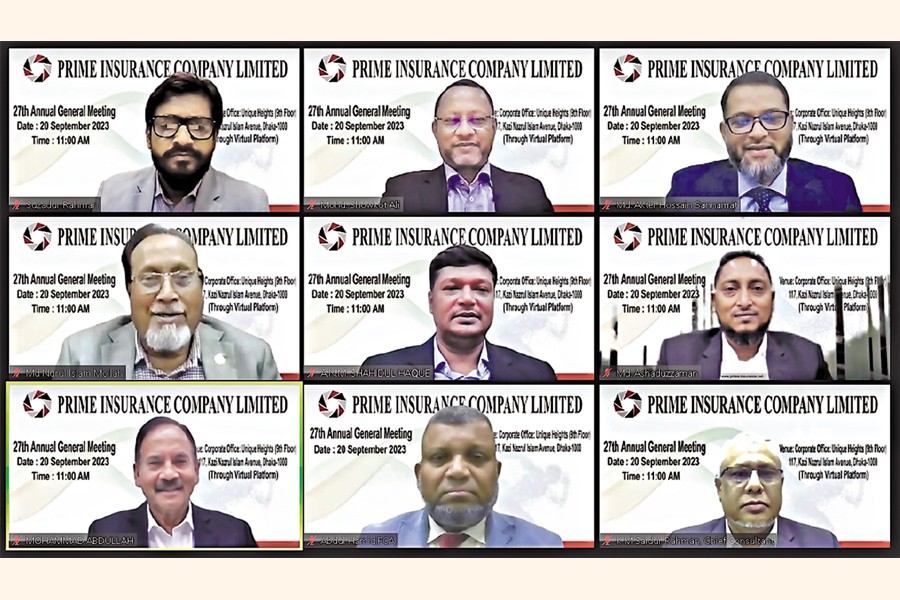The 27th Annual General Meeting of Prime Insurance Company Limited was held on Wednesday on a virtual platform. Suzadur Rahman, chairman of the company's board of directors, presided over the meeting. The meeting approved 10 per cent cash dividend for the shareholders, Chairman of Executive Committee Mohd. Showkat Ali, Chairman of Audit Committee & NRC Md. Akter Hossain Sannamat, Chairman of Claim and Re-Insurance Committee Mohammad Abdullah, Chairman of Investment Committee A.N.M. Shahidul Haque and Chief Executive Officer Abdul Hamid joined the AGM.