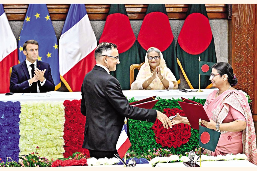 Prime Minister Sheikh Hasina and French President Emmanuel Macron witness the exchange of documents