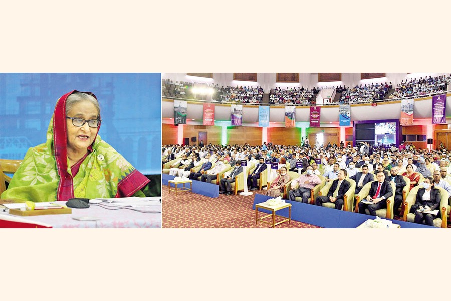 Prime Minister Sheikh Hasina speaking at the foundation stone laying ceremony of Ghorashal Palash Urea Fertiliser Factory in Narsingdi joining it from her official residence Ganobhaban virtually on Thursday — PID photo