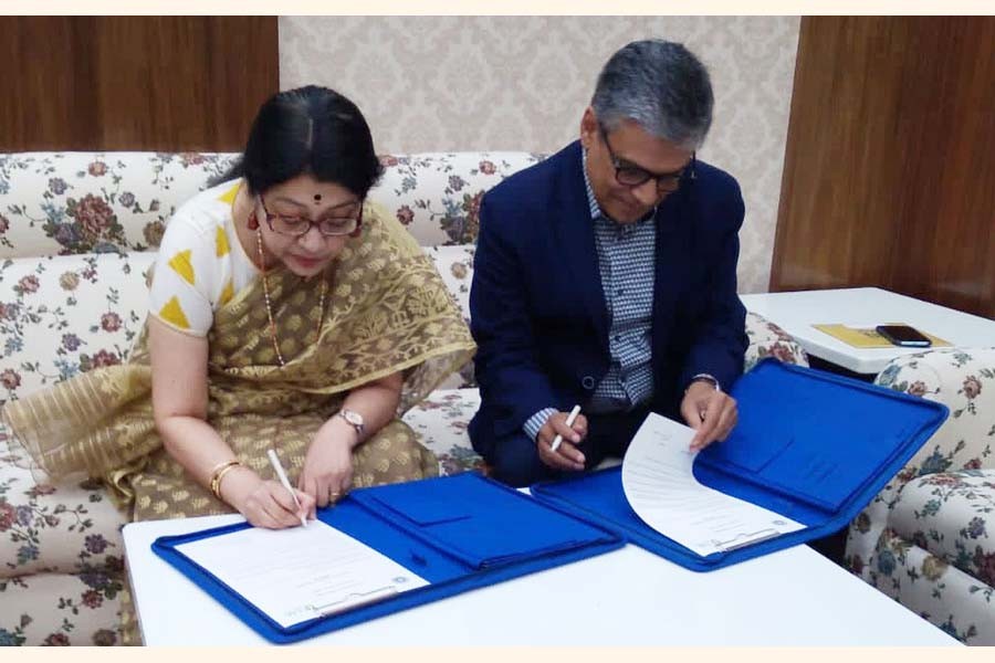 Professor Sonali Chakravarti Banerjee, Vice-Chancellor (VC), University of Calcutta, and Professor Imran Rahman, VC of University of Liberal Arts Bangladesh (ULAB), signing an Memorandum of Understanding (MoU) on the campus of the University of Calcutta recently on behalf of their respective organisations