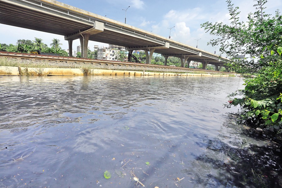 A water body has been created close to a railway line in Khilkhet area of the city for the purpose of fish farming, potentially posing a threat to the railway tracks. The photo was taken on Monday. — FE photo