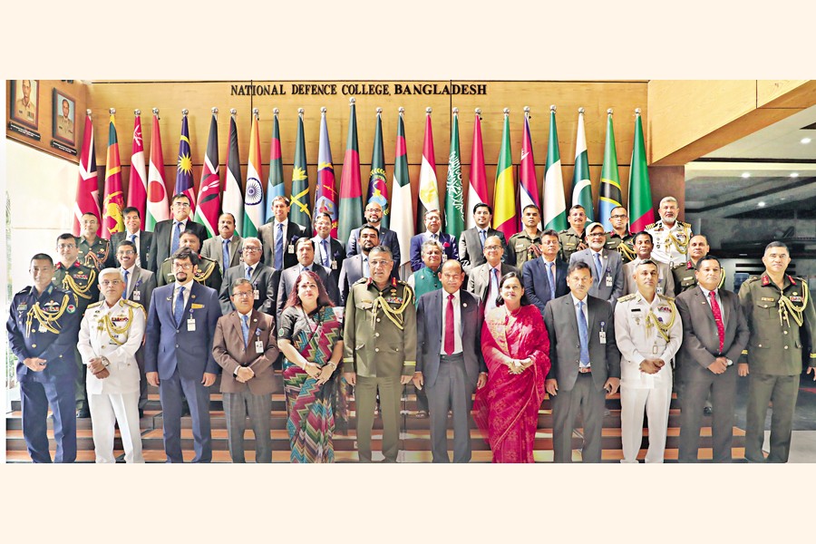 Railways Minister Nurul Islam Sujan poses for photograph with others at the certificate awarding ceremony of the Capstone Course 2022/2 at the National Defence College in the city's Mirpur area on Wednesday — ISPR
