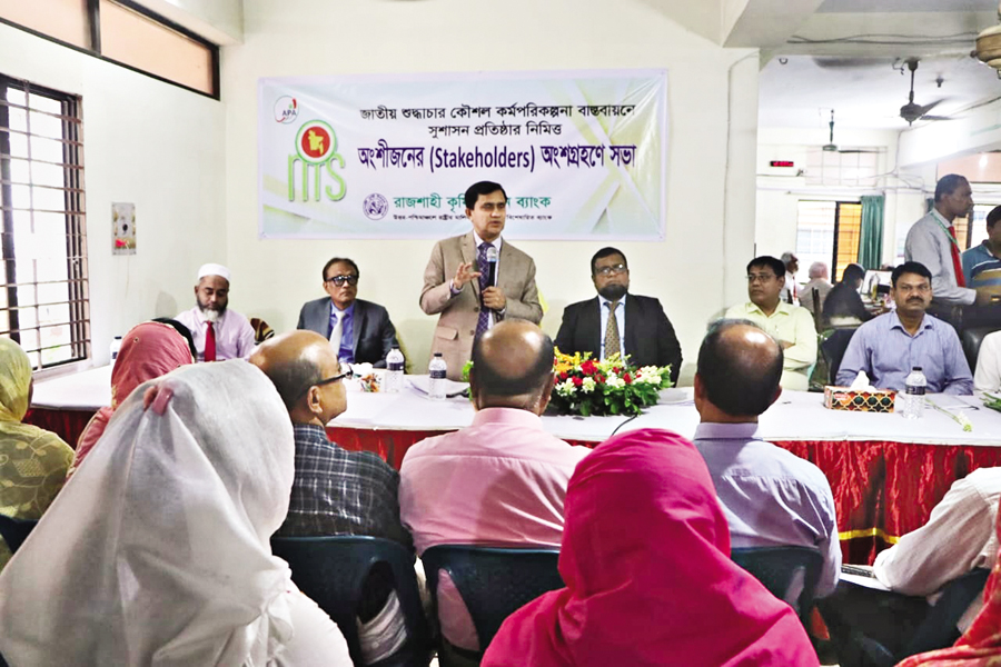 Rajshahi Krishi Unnayan Bank (RAKUB) has recently held a view-exchange meeting with the stakeholders at the bank's Rajshahi Branch to discuss ways to implement the National Purity Strategy Action Plan in order to establish good governance. Managing Director of the bank Niranjan Chandra Debnath was present as the chief guest while General Manager of RAKUB Rajshahi Division Md Atiqul Islam presided over the meeting. Deputy Managing Director of the bank Md A Rahim and General Manager (C.C.) of Administration Division Shawkat Shahidul Islam were present as special guests.
