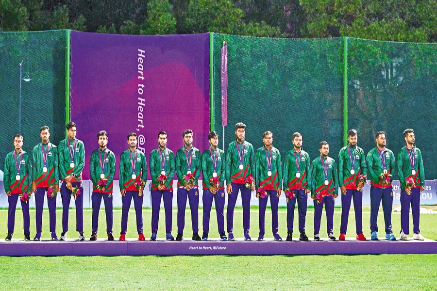 Rakibul Hasan's boundary from last ball enabled former Asian Games gold medalist Bangladesh Men's Cricket team to clinch a bronze medal in the ongoing Asian Games beating Pakistan by six wickets in a 3rd place deciding play-off match at the Zhejiang University of Technology Cricket ground in Hangzhou on Saturday, reports UNB.
