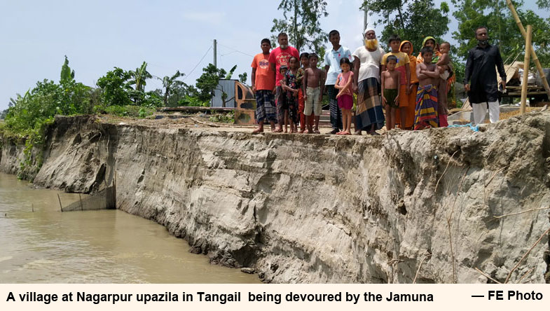 Our Correspondent from Tangail reports: With the rise of water level erosion by the mighty rivers Jamuna and Dhaleswari has taken a devastating turn. Many villages of Tangail Sadar, Bhuapur, Kalihati and Nagorpur upazila have been destroyed by erosion of the Jamuna River.
