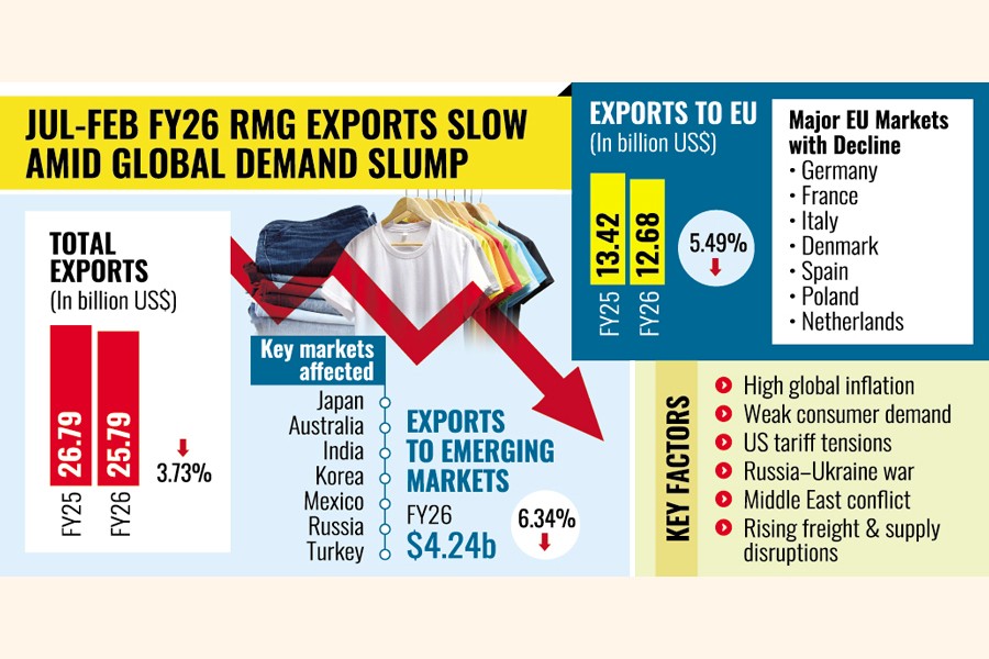 Overall, Bangladesh's total RMG exports fell 3.73 per cent year on year to US$25.79 billion in the first eight months of FY2025-26, compared with US$26.79 billion during the same period of the last fiscal year.