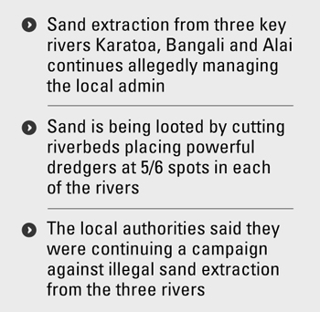 Unauthorised sand lifting by these unscrupulous people allegedly in connivance with some local government officials is also exacerbating soil erosion on the rivers' banks. Totally unmindful of its disastrous impact, they are continuing sand extraction by cutting riverbeds placing powerful dredgers at 5/6 spots in each of the rivers.