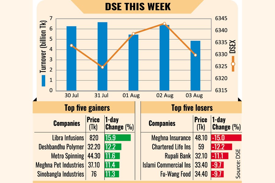DSEX, the prime index of the Dhaka Stock Exchange, finally settled the week 9.65 points lower at 6,329.86. The DSEX lost more than 36 points in the past two straight weeks.