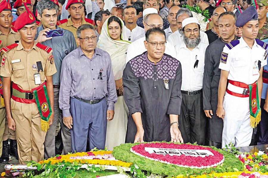 Senior Secretary of the Defence Ministry Golam Md Hasibul Alam placing a wreath at the portrait of Father of the Nation Bangabandhu Sheikh Mujibur Rahman at Bangabandhu Memorial Museum at Dhanmondi in the city on Tuesday, on the occasion of the 48th Martyrdom Anniversary and National Mourning Day 2023 — ISPR