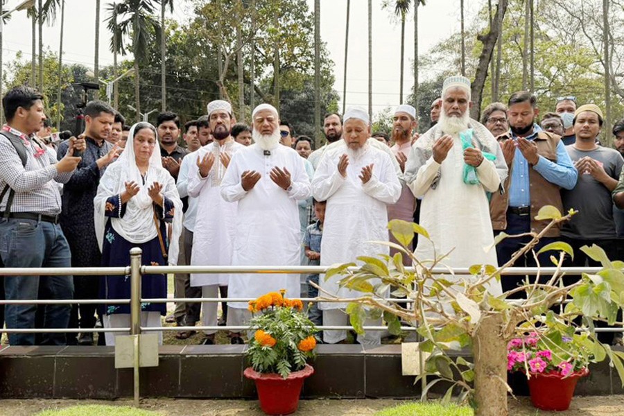Leader of the Opposition in Parliament and Jamaat-e-Islami Ameer Shafiqur Rahman, along with family members of martyred Army officers, offering munajat at the Banani Military Graveyard in the capital on Wednesday, marking the 17th anniversary of the 2009 Pilkhana carnage. — Collected
