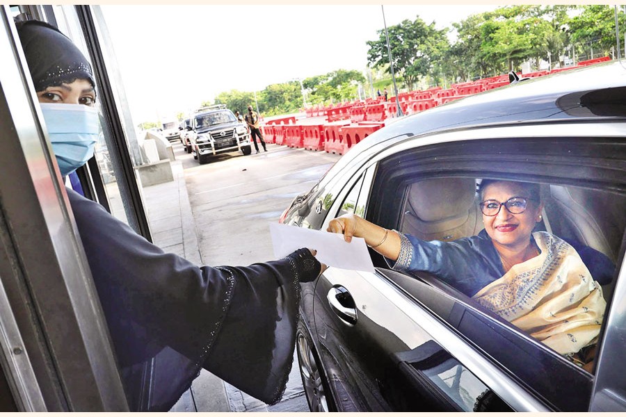 Sheikh Rehana, daughter of Bangabandhu Sheikh Mujibur Rahman and younger sister of Prime Minister Sheikh Hasina, pays toll at Mawa point of Padma Bridge on her way to Tungipara of Gopalganj on Friday — PID