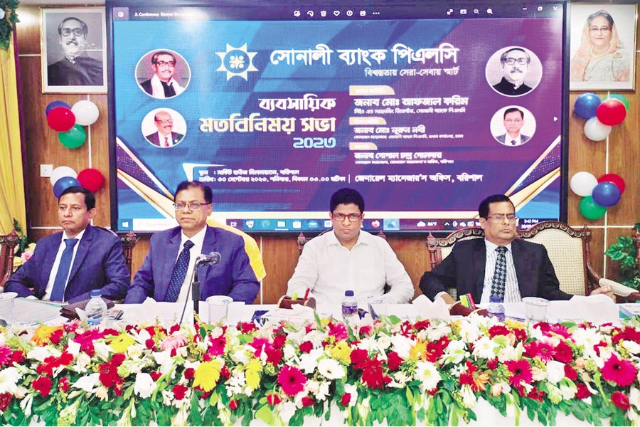 A business meeting of General Manager's Office of Sonali Bank PLC was arranged at the Circuit House auditorium in Barishal city on Saturday. Managing Director and CEO of the bank Md Afzal Karim attended the meeting as the chief guest while Deputy Commissioner of Barishal Shahidul Islam and General Manager of Sonali Bank head office Md Nurun Nabi were the special guests. General Manager of Barishal GM Office Gopal Chandra Golder presided over the function.