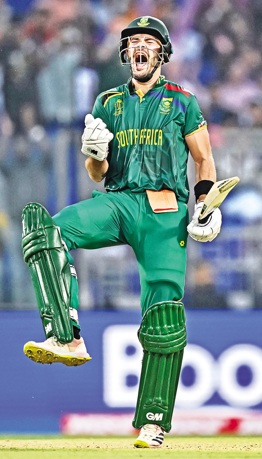 South Africa's Aiden Markram celebrating after scoring a century during the 2023 ICC Men's Cricket World Cup ODI match against Sri Lanka at the Arun Jaitley Stadium in New Delhi on Saturday — AFP