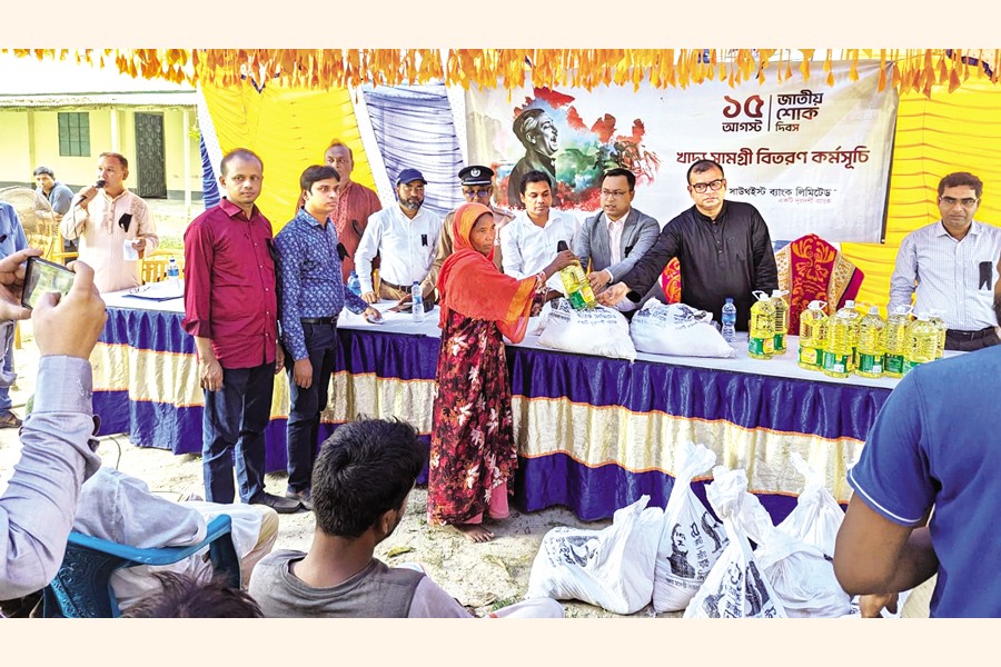 As part of its month-long programmes marking the National Mourning Day, Southeast Bank distributed food items among the distressed people in Rangpur recently. Abu Sayeed, UNO of Badarganj Upazilla, and Md Monjurul Kabir Talukder, Head of Branch, Southeast Bank, Rangpur Branch, along with other officials were present at the programme.