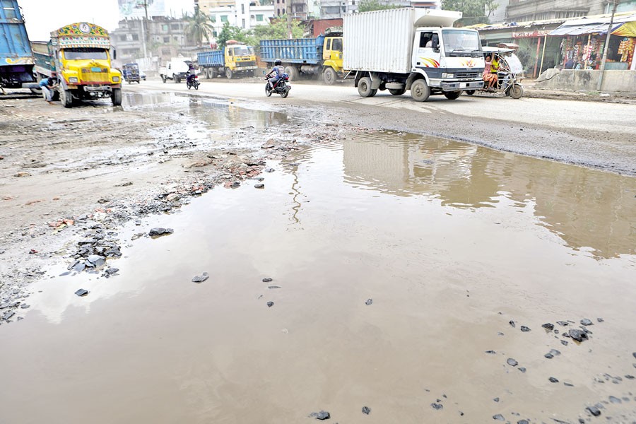 Stagnant rainwater on the dilapidated road in Shyampur industrial area of the city causes immense suffering to commuters. The photo was taken on Sunday — FE Photo