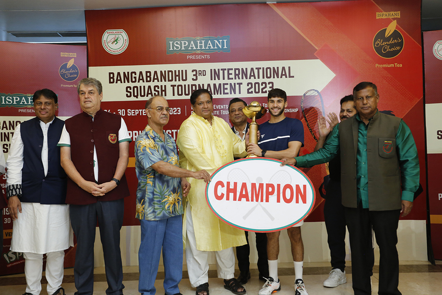 State Minister for Youth and Sports Zahid Ahsan Russel, MP, handing over the winner trophy to Egypt's Karim Al Torke who became champions of the Bangabandhu 3rd International Squash Tournament at a prize giving ceremony at Gulshan Club on Saturday. Ispahani sponsored the 5-day tournament. President of Bangladesh Squash Rackets Federation Muhammad Faruk Khan, MP, Vice President of the Bangladesh Squash Racket Federation and Chairman of the Ispahani Group Mirza Salman Ispahani were also present on the occasion