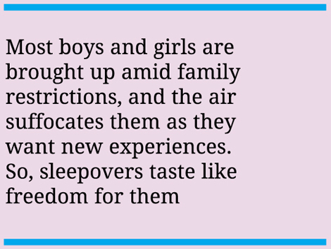 Thus, many boys and girls stay away from sleepovers, citing reasons of uneasiness and discomfort.