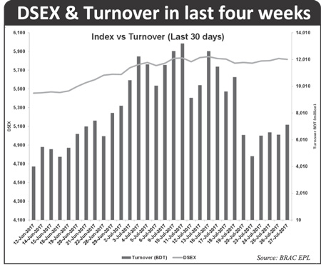 Week-on-week, DSEX, the prime index of the Dhaka Stock Exchange (DSE), which replaced the DGEN in four-and-a-half-year back, went up by 32.60 points or 0.56 per cent to settle at 5,815.