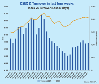 EBL Securities, a stockbroker, said, "The market witnessed both selling spree and position taking on sector specific issues, resembled through higher market turnover".