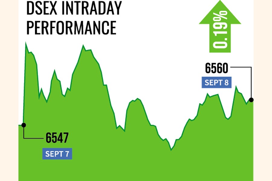 At the end of the session, DSEX, the prime index of the Dhaka Stock Exchange (DSE), went up by 12.55 points or 0.19 per cent to settle at 6,560. DSEX gained 129 points in the past three trading days.