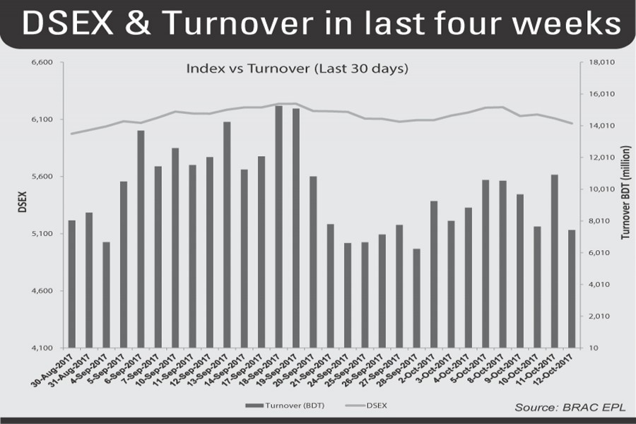 The total turnover for the week stood at Tk 46.23 billion on the DSE which was Tk 36.70 billion in the week before, rising 26 per cent as the last week saw five trading sessions instead of previous week's four.