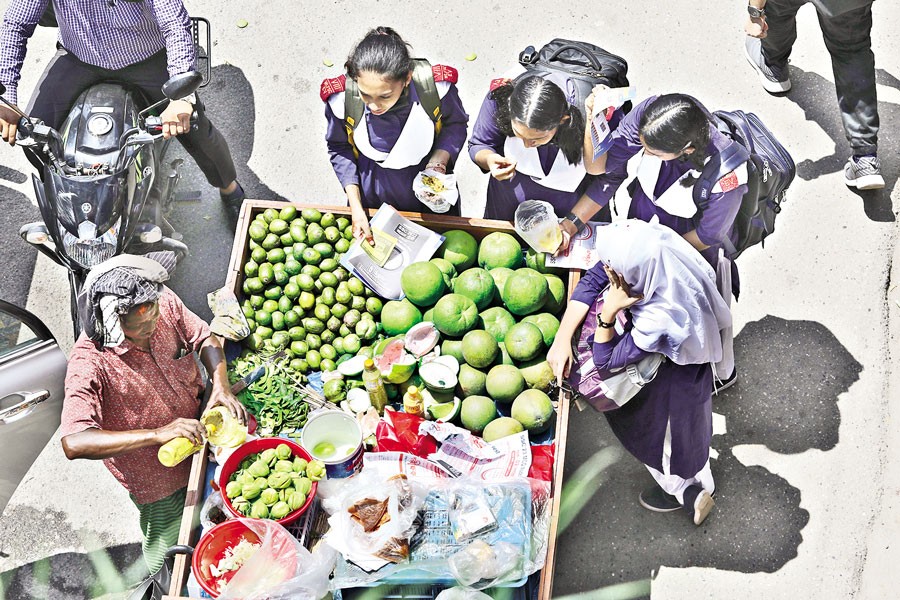 Students are buying sour Pomelo and Hog Plum mixed with mustard sauce from a van parked on the road in front of the Willes Little Flower School and College at Kakrail in Dhaka on Monday. Though the seasonal fruits are no doubt good for health, consuming the mouth-watering fruits sold in an unhygienic condition amid dust might cause stomachache and other health problems.