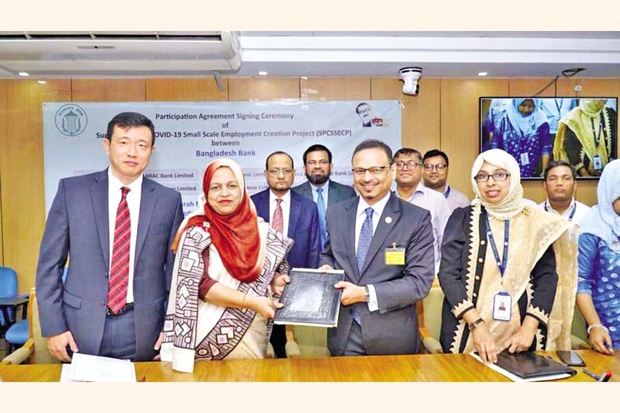 Kaiser Tamiz Amin, Managing Director of United Finance Limited, exchanging documents with Ms. Nurun Nahar, Executive Director, Bangladesh Bank for the ADB-funded "Supporting Post Covid-19 Small Scale Employment Creation Project".