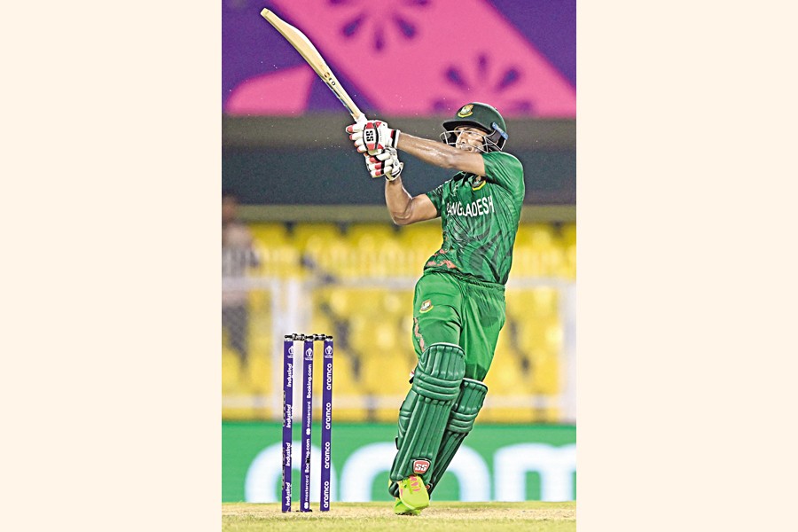 Tanzid Hasan plays a shot during a warm-up match between Bangladesh and Sri Lanka ahead of the ICC Men's Cricket World Cup, at the Assam Cricket Association Stadium in Guwahati on Friday. Chasing a target of 264, Bangladesh won the match by 7 wickets. — AFP