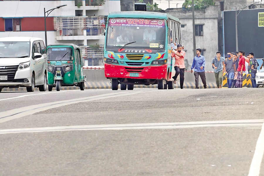 The bus is not supposed to stop here - taking in and dropping off passengers right on the Mayor Mohammad Hanif Flyover. Though this is a common scene, the illegal practice might cause fatal accidents any time. The photo was taken in Sayedabad area of the capital on Sunday. — FE photo
