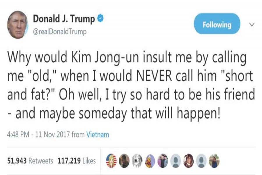The North Korean dictator Kim Jong-un has been the butt of President Trump's tweets. Insulting him in his tweets has been his most favourite pastime. A sample tweet that the President posted at 3.28 in the morning Washington time on September 27 read: "Kim Jong Un of North Korea, who is obviously a madman who doesn't mind starving or killing his people, will be tested like never before!" The North Korean dictator remained calm and unprovoked with the US President's insulting tweets till his rhetoric on him and North Korea on his just-concluded Asian trip forced North Korea to issue a statement that went right under the skin of the US President in an unusual manner.