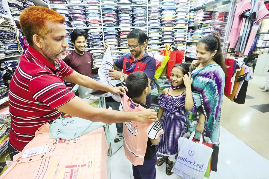 Members of this small family are all smiles as one of them is trying out a new dress at a shop at the Twin Tower Concord Shopping Complex in Dhaka's Shantinagar on Monday. With one of the biggest religious festivals of Muslims approaching, more and more people are turning out to the city markets to pick up new dresses — FE photo
