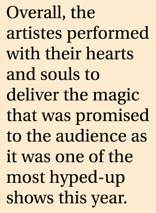 Overall, the artistes performed with their hearts and souls to deliver the magic that was promised to the audience as it was one of the most hyped-up shows this year. However, it was also met with tragedy as the mismanagement brought many unfavourable outcomes.