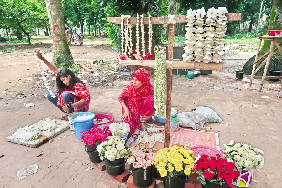 These two little girls are busy making flower garlands to be sold, among other flower items, to the visitors at Suhrawardy Udyan in Dhaka on Tuesday. Due to a rising living cost these days, the middle-class section of society does not have the luxury of spending money on buying flowers. Thus, as these sellers validate, their income has dropped significantly — FE photo by Shafiqul Alam