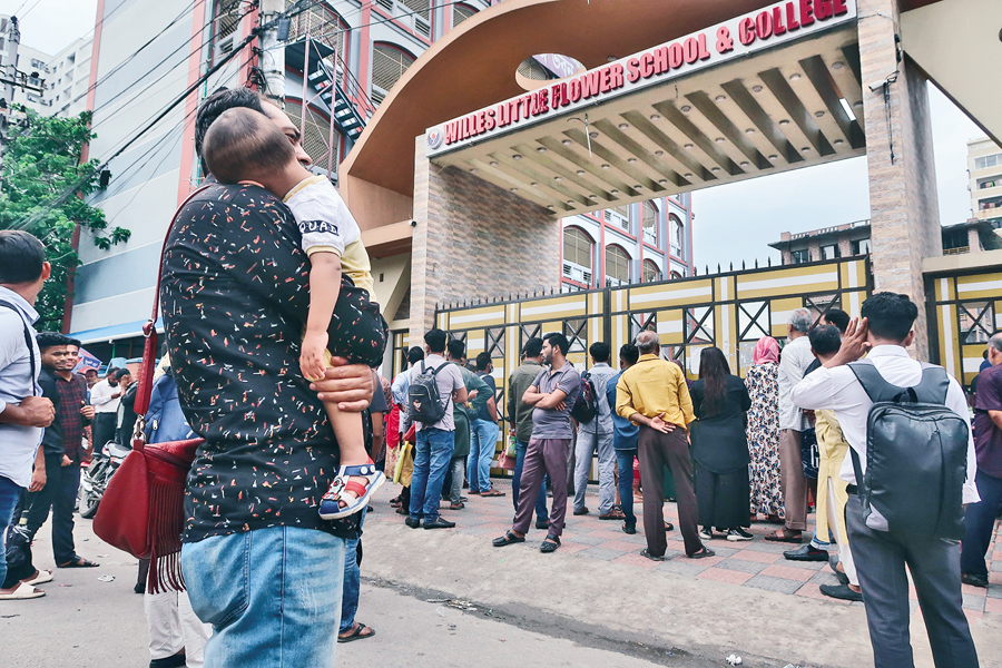This father is taking care of his child as he waits outside the Willes Little Flower School and College in Dhaka's