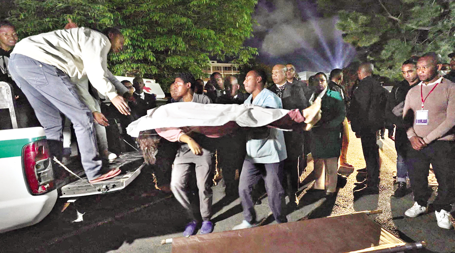 This videograb shows a body being brought to hospital in Antananarivo on Friday. At least 13 people, including seven children, were killed in a crowd stampede at a stadium in the Madagascar capital — AFP