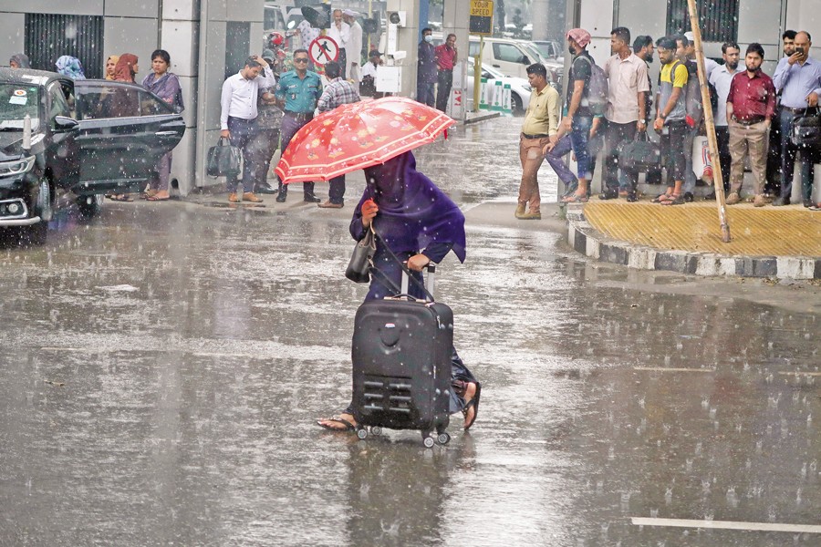 This woman with a trolley bag walks to her destination amid rain that spelled trouble for people during the busy Wednesday noon. The photo was taken in front of the Secretariat. — FE photo