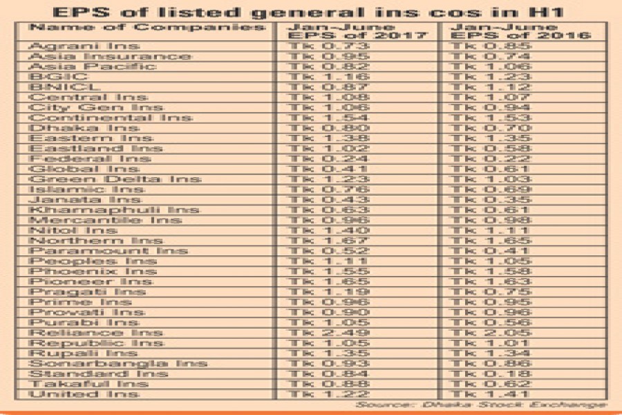 The general insurance companies, whose EPS rose in January-June period of 2017 are: Asia Insurance, Central Insurance, City General Insurance, Continental Insurance, Dhaka Insurance, Eastern Insurance, Eastland Insurance, Federal Insurance, Green Delta Insurance, Islamic Insurance, Janata Insurance and Kharnaphuli Insurance.