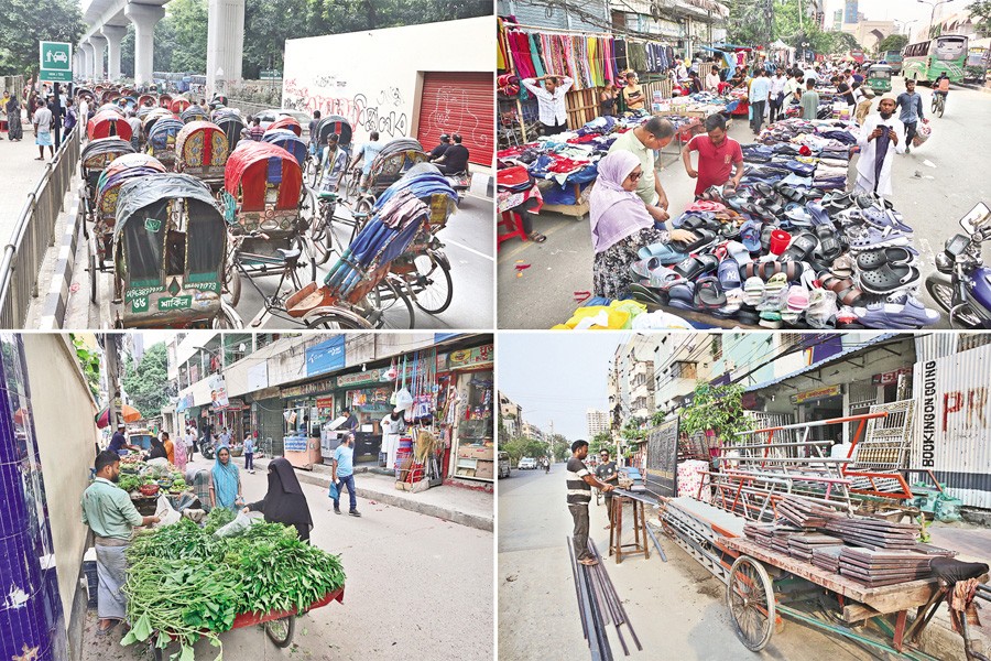 Barring a few major city streets that are off limits to rickshaws and vendors, most roads, lanes, by-lanes and pavements remain occupied by rickshaws, battery-run or otherwise, hawkers of all types during peak hours. Shops dump their goods on the pavement leaving almost no room for the pedestrians. Pictures (clockwise) above say it all: (1) Rickshaws seen occupying the road near the Dhaka University metro station (2) Main street in Gulistan area (3) Kalshi Road at Pallabi, and (4) Vendors selling vegetables at Segunbagicha. — FE photos