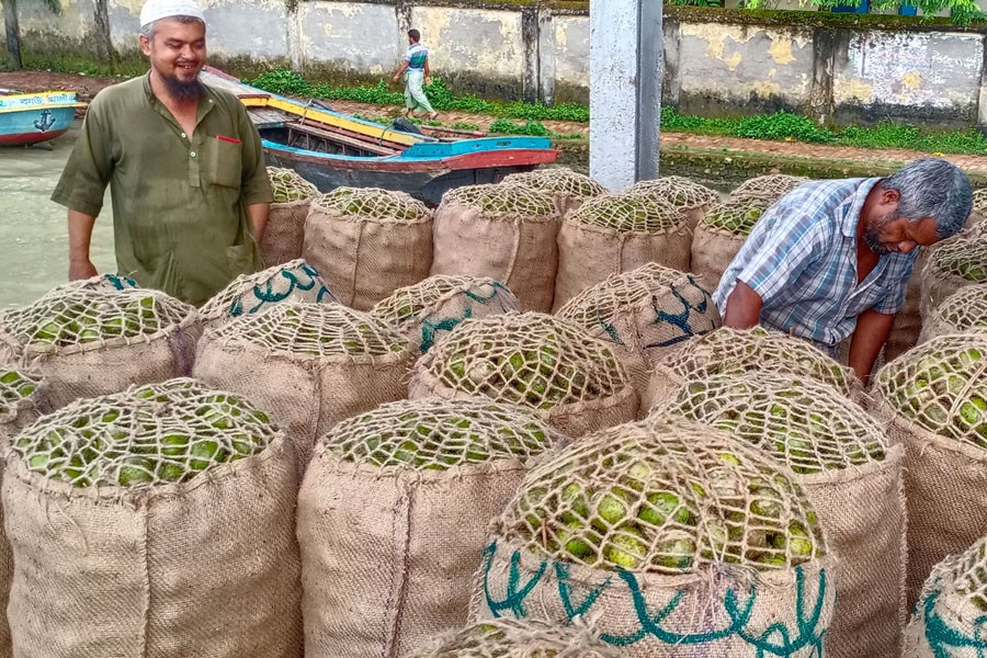 Traders pack hogplums for selling during the ongoing peak season stretching from mid-June to mid-September. The demand for the vitamin C-enriched fruit has increased over the time. The photo was snapped from Kawkhali upazila of Pirojpur on Wednesday — Focus Bangla