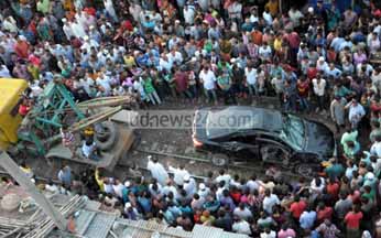 Three people have been injured critically when their car was hit by a train on the railway track at the Malibagh rail crossing in the city. Dhaka Railway Police Station OC Abdul Majid said the accident took place around 5pm on Friday. Kamalapur Railway Station’s Traffic Inspector Humayun Kabir said the ‘Chattala Express’ train was on its way to Chittagong from Dhaka. The car was crumpled by the impact of the crash, he said. Railway Assistant Director (operations) Syedur Rahman said the level crossing gates were down as the train was approaching. ‘But that private car got on to the crossing from the opposite side, and then suddenly its engine stopped,’ he said. ‘The train’s driver started blowing the whistle and slowed down the train. Even so the car was hit and was dragged for some distance,’ he said, according to bdnews24.com.