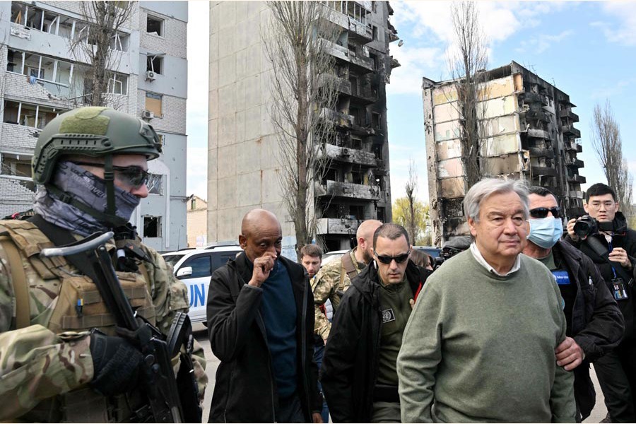 "I imagine my family in one of those houses that is now destroyed and black. I see my granddaughters running away in panic," the UN chief said in Borodianka, a ruined town north-east of the Ukrainian capital.