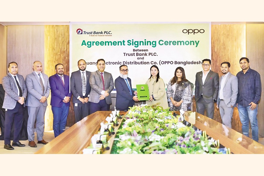 A Deed of Agreement has been signed between Trust Bank PLC and Heguang Electronic Distribution Co. Ltd. (OPPO Bangladesh). The signing ceremony was attended by Md. Kamal Hossain Sarkar, Deputy Managing Director and Head of the Islamic Banking Division of Trust Bank PLC, along with other senior officials from both organisations. The agreement was signed by Md Mostafa Musharraf, Head of the Card Division of Trust Bank PLC, and Wei Yanfang (Yana), Head of the department, HR & Admin of Heguang Electronic Distribution Co. Ltd. on behalf of their respective organisations. Under this agreement, all credit cardholders of Trust Bank will be able to purchase OPPO smartphones from designated OPPO showrooms and online platform with 0 per cent EMI facility up to 12 months.